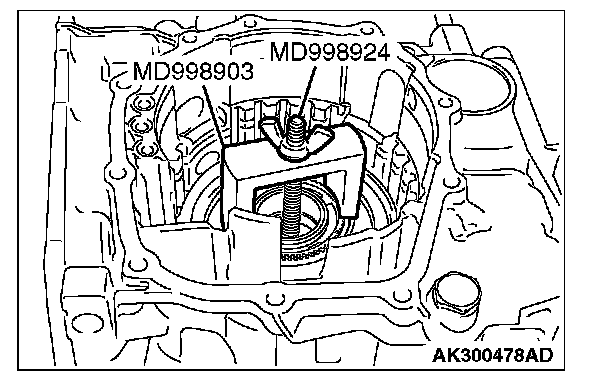 7. Set special tools MD998903 and MD998924 as shown, and then compress the one-way clutch inner race and install the snap ring.