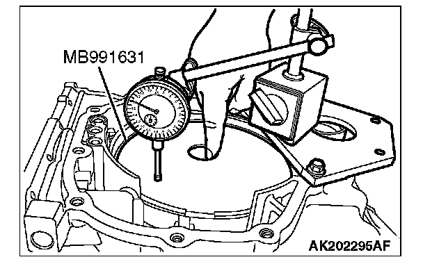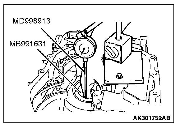 18. Turn the transaxle over so that the installation surface of the torque converter housing is facing up. Install special tool MD998913 in a dial gauge, and then move special tool MB991631 and measure its movement.