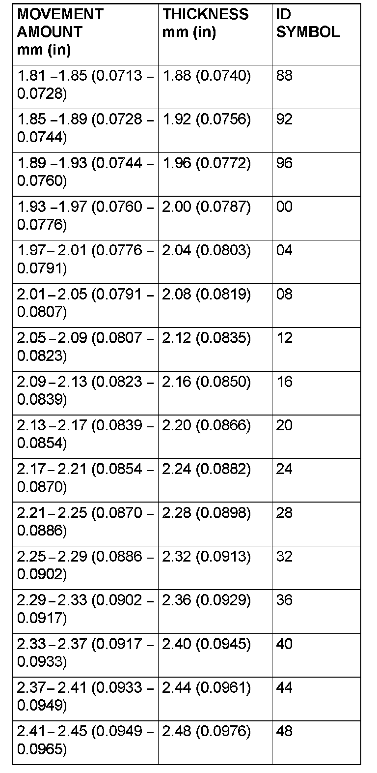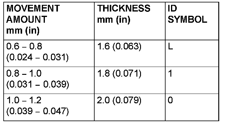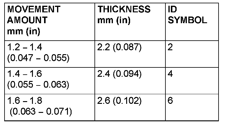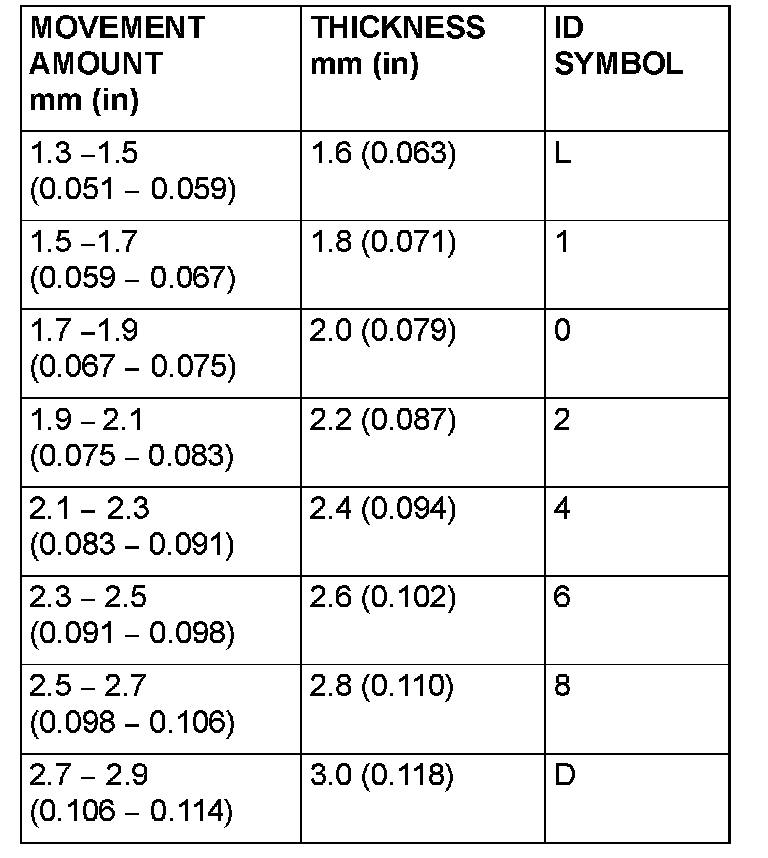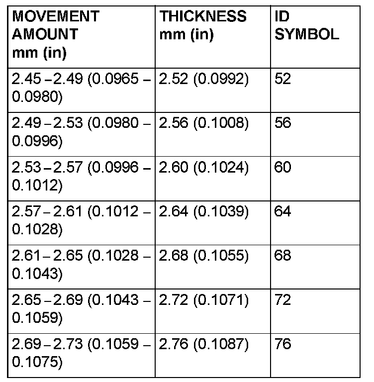 28. Select a spacer whose thickness corresponds to the measured amount of movement from the following table.