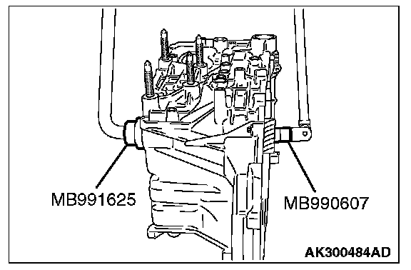 25. Apply transmission fluid to a new lock nut, and use special tools MB990607 and MB991625 to tighten the lock nut to the specified torque. Then turn back one turn, and tighten to the specified torque again.
