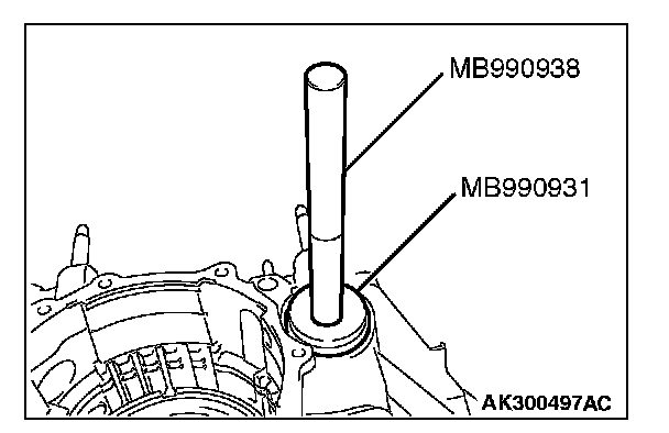 22. Use special tools MB990930 and MB990938 to tap the output shaft bearing outer race in the transaxle case.