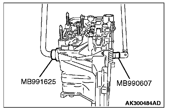 56. Use special tools MB991625 and MB990607 to remove the output shaft lock nut.