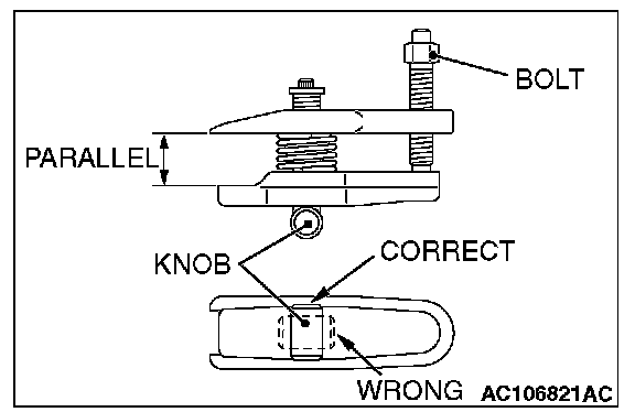 2. Turn the bolt and knob as necessary to make the jaws of special tool MB991897 parallel, tighten the bolt by hand and confirm that the jaws are still parallel.