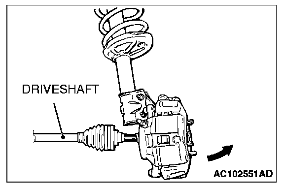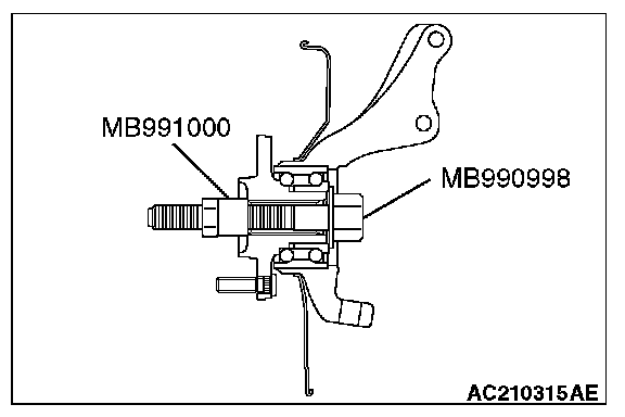 Do not apply pressure to the wheel bearing by the vehicle weight to avoid possible damage when the drive shaft is removed. If, however, vehicle weight must be applied to the bearing to move the vehicle, temporarily secure the wheel bearing by using special tools MB991000 and MB990998.