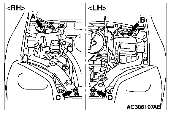 1) Set special tool MB991895 (engine hanger) to the front fender assembling bolts (A and B) and (C and D) as shown.