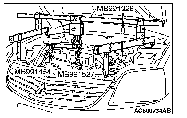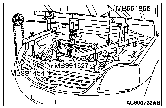 2) Set special tool MB991527 and MB991454 (chain) to hold the engine/transaxle assembly.
