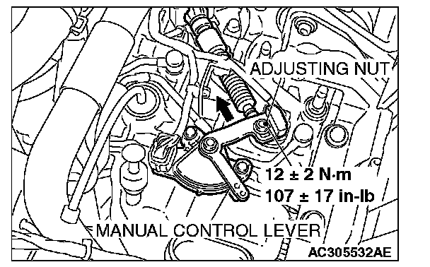 2. Place the cable stud into the manual control lever slot and install the nut loosely. Gently push the transaxle control cable into the manual control lever slot until the cable is taut. Tighten the nut to the specified torque.
