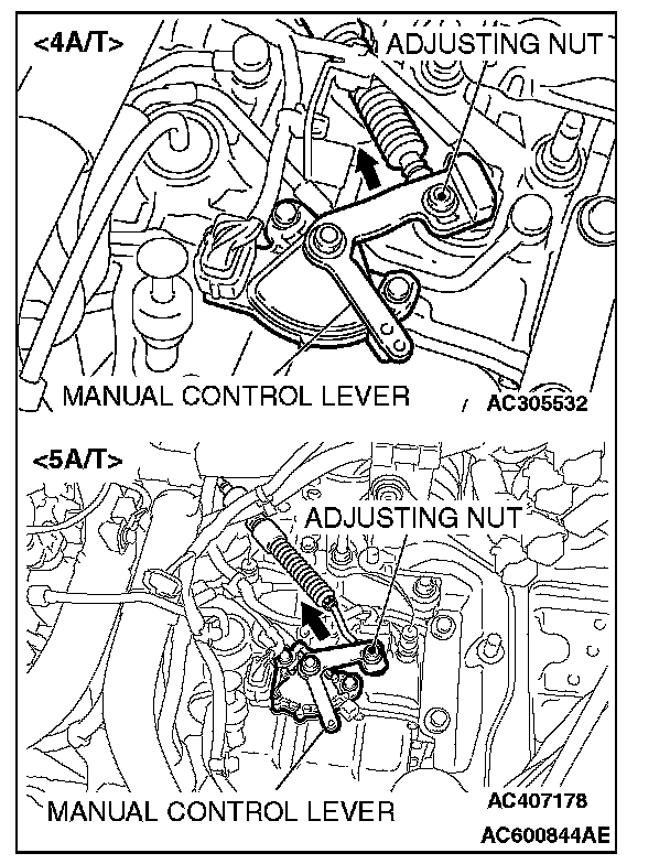 3. Gently push the transaxle control cable in the direction of the arrow, and then tighten the adjusting nut.