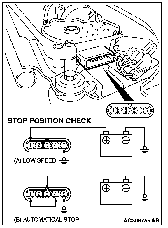 2. Run the windshield wiper motor at low speed, then disconnect the battery in the middle of the motor turning and check to see that the motor stops.