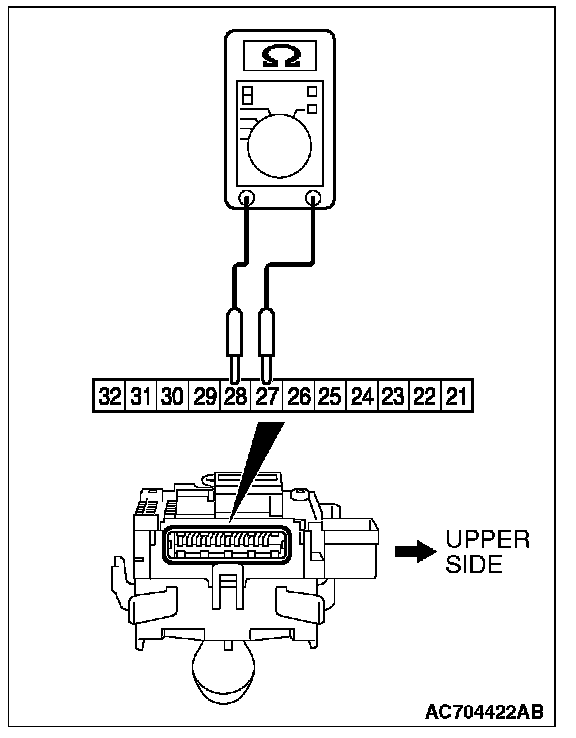 Check that the resistance varies between 0 and 1 kW when the windshield intermittent interval is turned from FAST to SLOW by after measuring resistance between connector terminals 27 and 28 at the column switch.