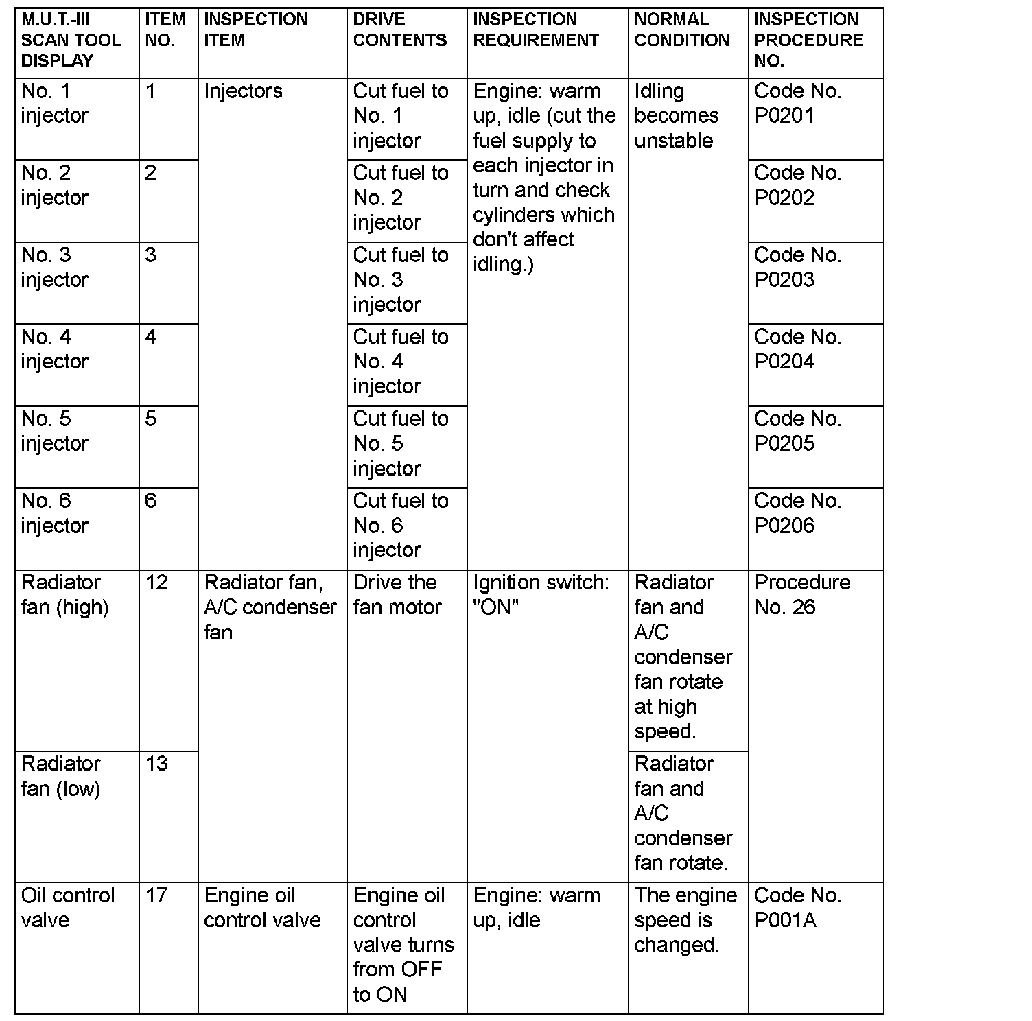 Actuator Test Reference Table