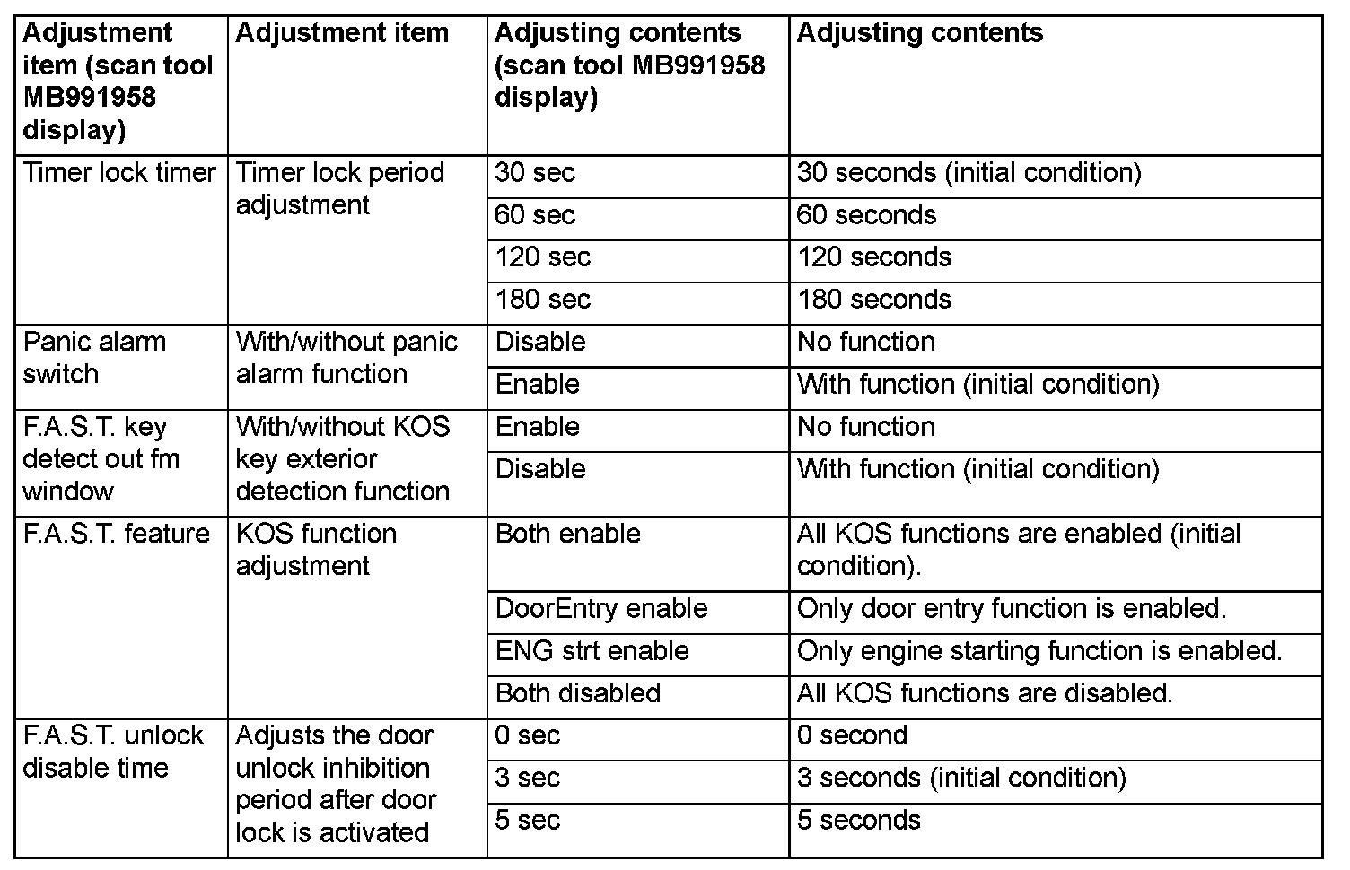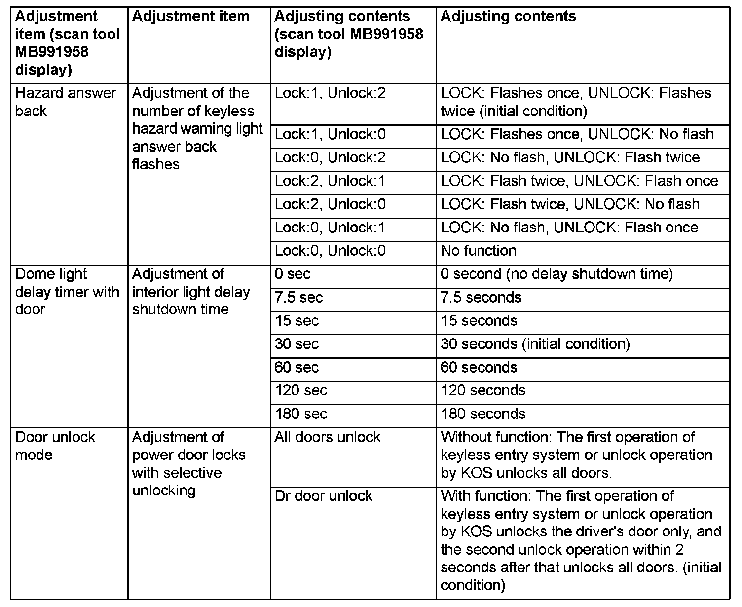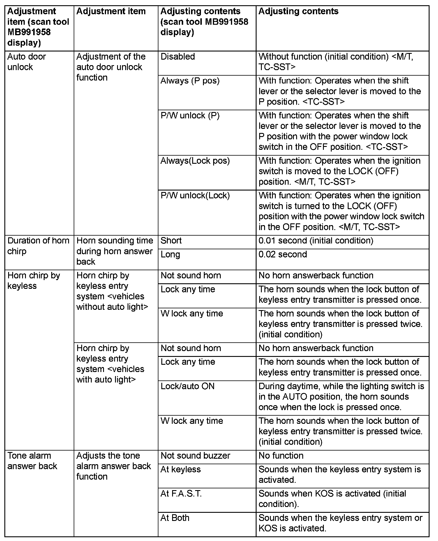 By operating the ETACS system or MMCS of scan tool MB991958, the following functions can be programmed. The programmed information is held even when the battery is disconnected.