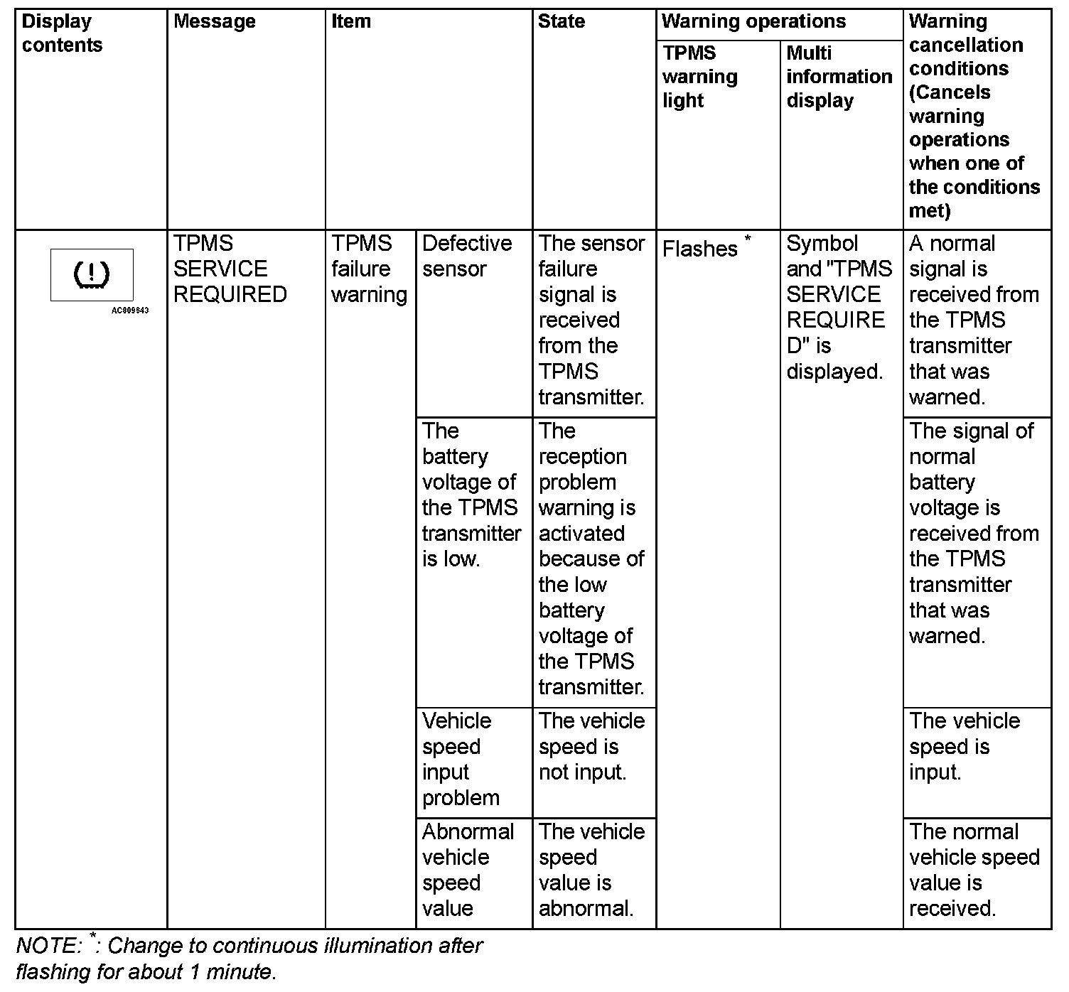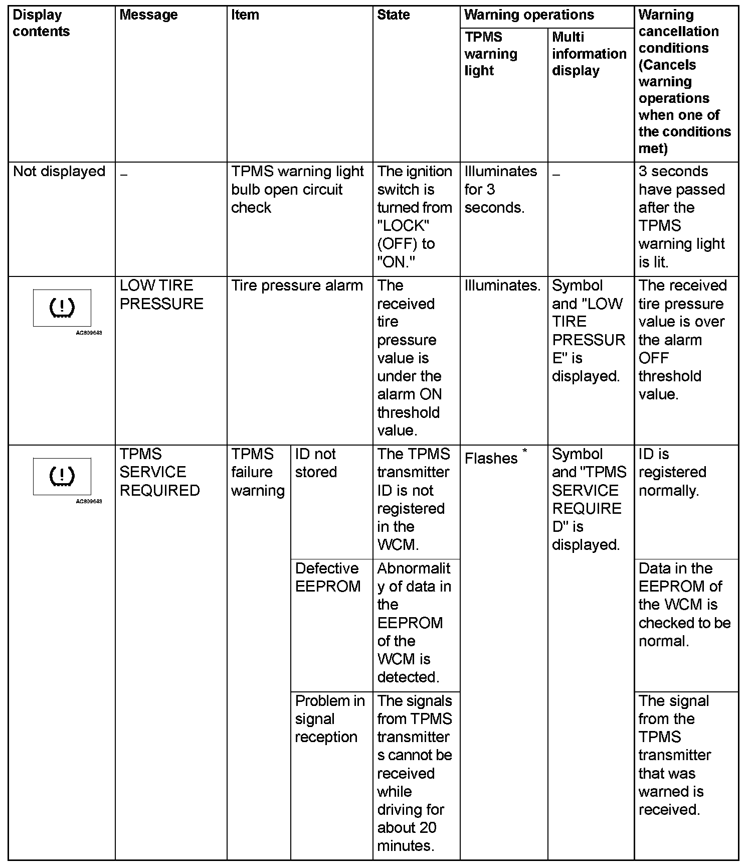 If the TPMS fails or the tire pressure is low, the WCM warns the driver of that state by the TPMS warning light and the multi information display in the combination meter.