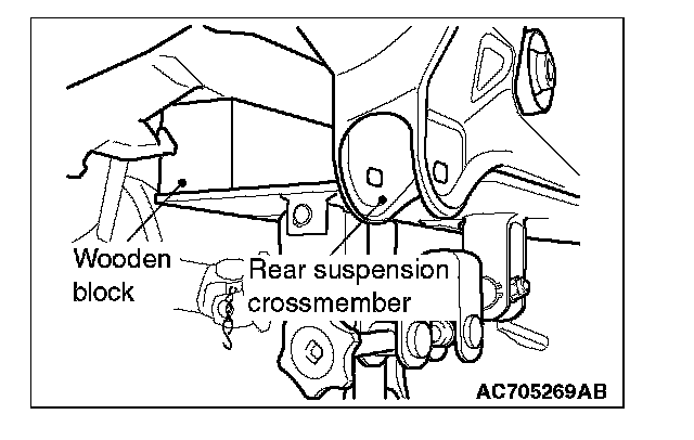 Place a wooden block against the bottom of rear suspension crossmember front, and remove the crossmember. Do not tilt the crossmember during removal.