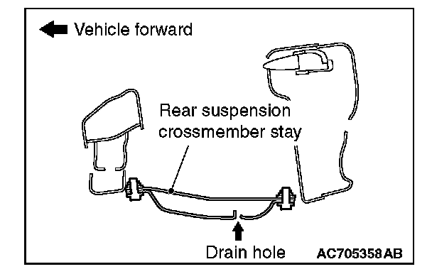 Install the rear suspension crossmember stay so that the water drain hole is positioned rearward.