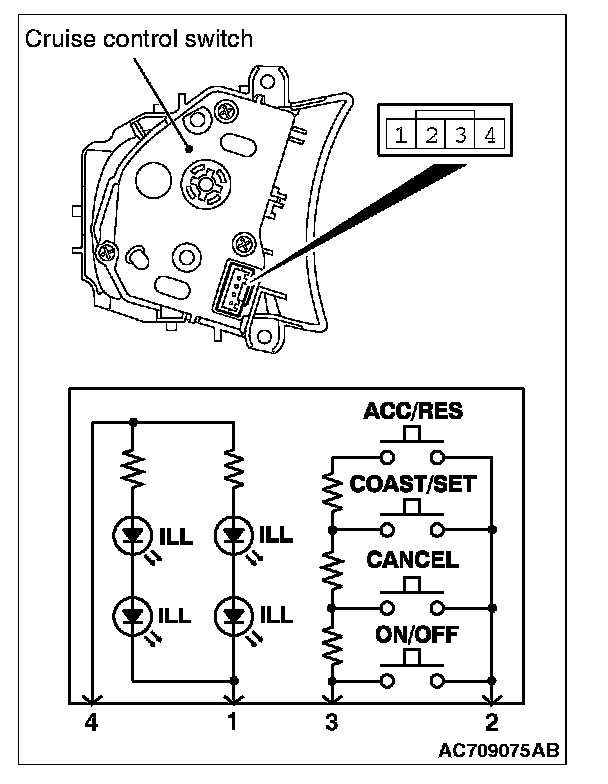 3. Check that the cruise control switch illuminates when a positive battery terminal is connected to the connector terminal number 4, and terminal number 1 is grounded.