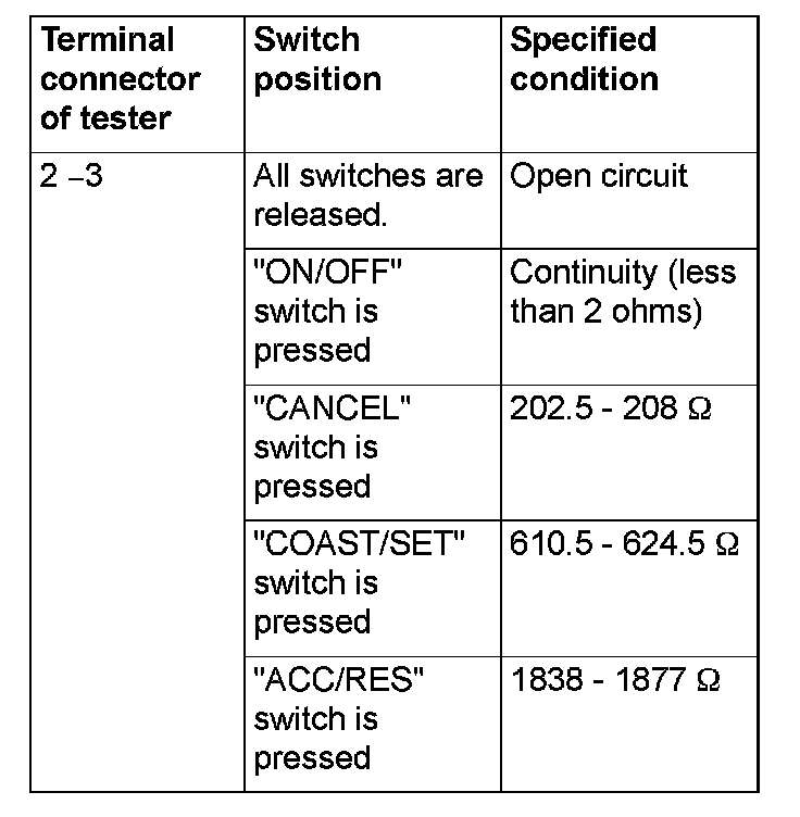 2. Measure the resistance between terminal number 2 and terminal number 3 when each of the "ON/OFF", "CANCEL", "COAST/SET" and "ACC/RES" switches is pressed. If the values measured at the time each switch is pressed correspond to those in the table below, the resistance values are correct.