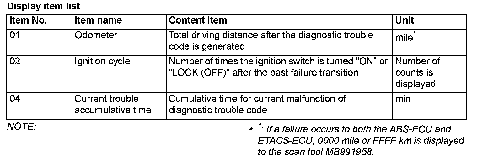 When detecting fault and storing the DTC, the ECU connected to CAN bus line obtains the data before the determination of the DTC and the data when the DTC is determined, and then stores the ECU status of that time. By analyzing the data from scan tool, the troubleshooting can be performed more efficiently. The displayed items are as shown in the table below.