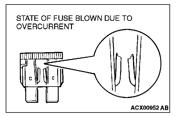 The illustration shows the state of a fuse blown due to this cause. In this case, do not replace the fuse with a new one hastily since a current heavy enough to blow the fuse has flowed through it. First, check the circuit for shorts and check for abnormal electric parts. After correcting shorts or replacing parts, use only a fuse of the same capacity as a replacement. Never use a fuse of larger capacity than the original fuse. If a larger capacity fuse is used, electric parts or wiring could be damaged, or could start a fire.