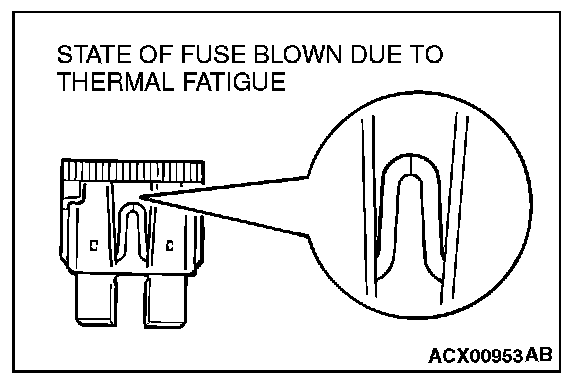 When a fuse is blown, there are two probable causes. One is that it is blown due to flow of current exceeding its rating. The other is that it is blown due to repeated on/off current flowing through it. Which of the two causes is responsible can be easily determined by visual check as described below.