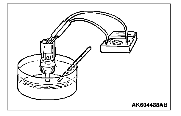 2. With the temperature sensing portion of engine coolant temperature sensor immersed in hot water, check the resistance.