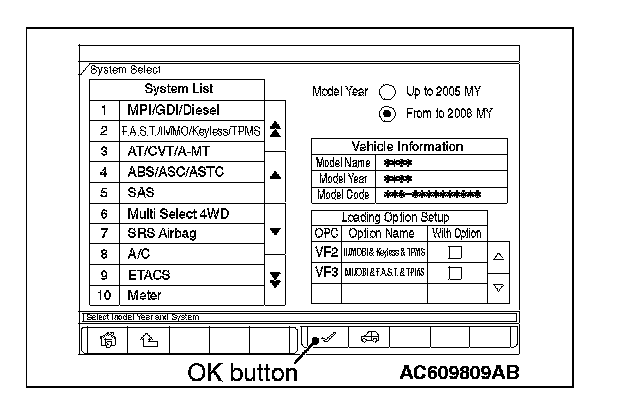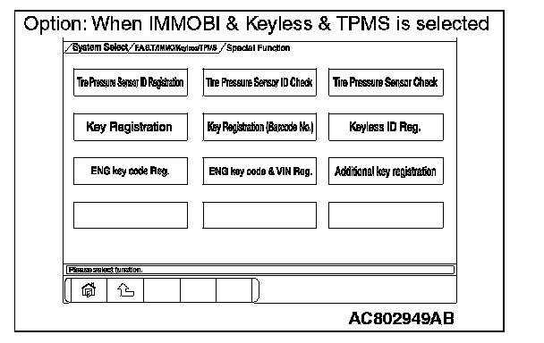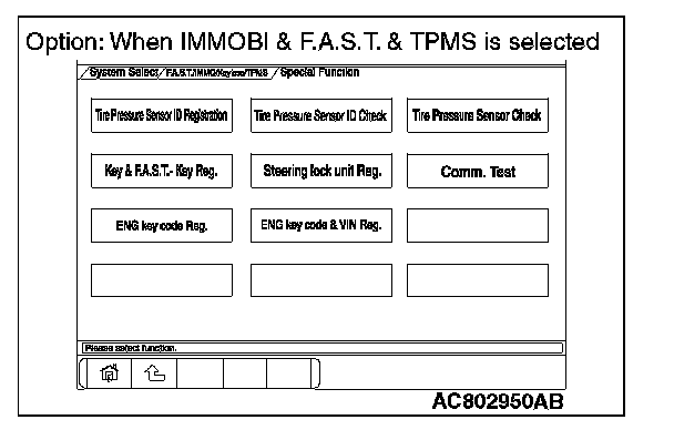 8. Select "F.A.S.T./IMMO/Keyless/TPMS" button from the "System Select" screen. Then, select the applicable option code item and push the OK button.