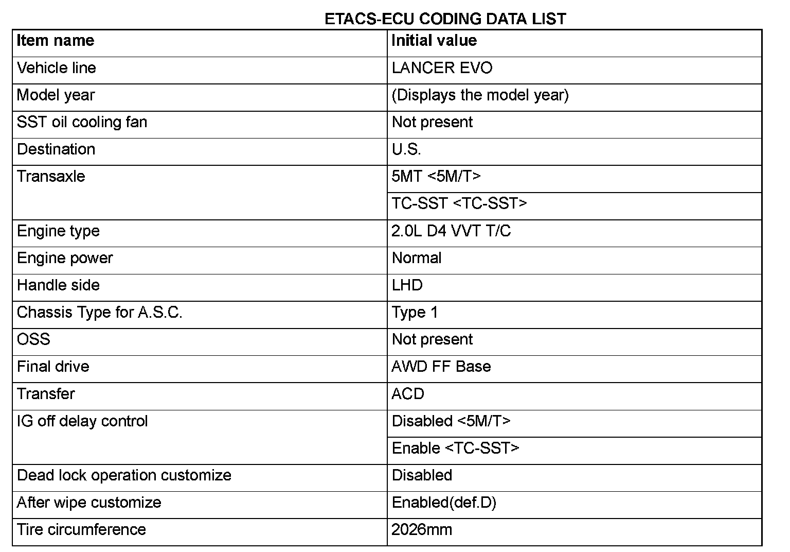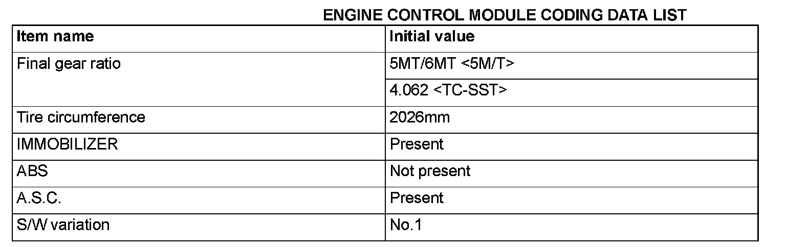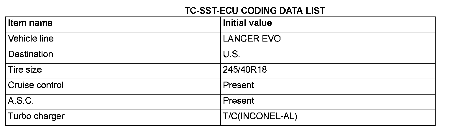Before troubleshooting, check that the coding data written into the engine control module, TC-SST-ECU and ETACS-ECU are normal. If they are not the same as the initial settings, various functions and systems will not work correctly.