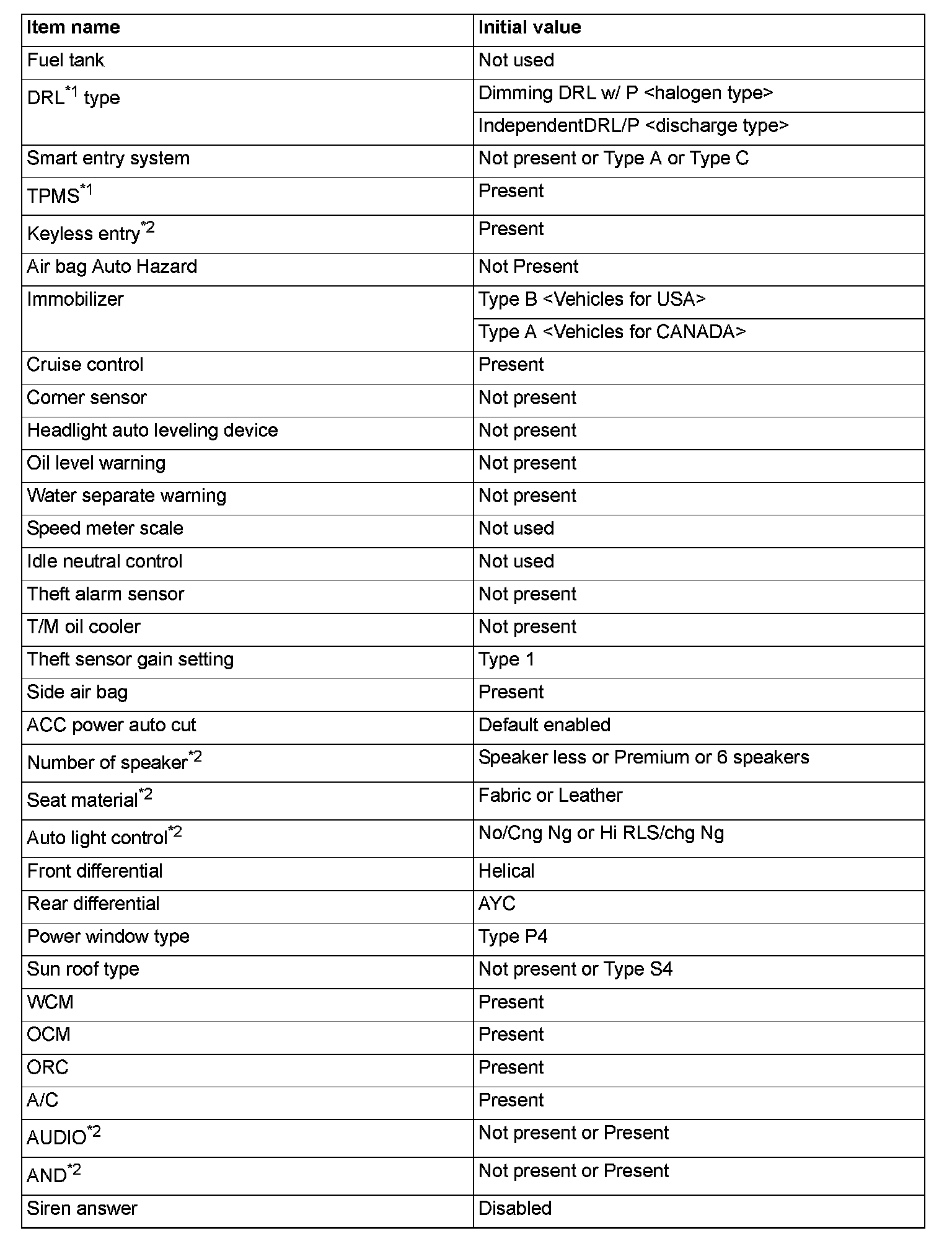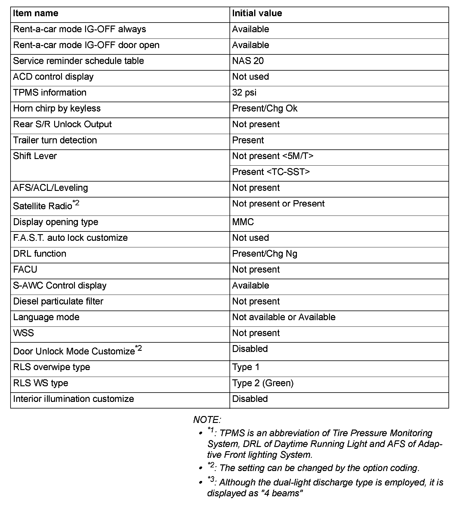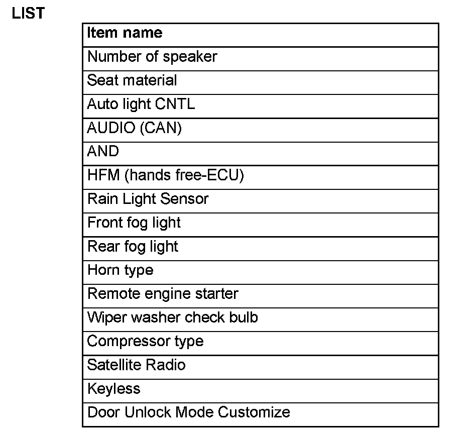 ^ If there is any item indicated by the option coding after equipment change, set ETACS-ECU so that the option coding data corresponds with the equipment content. Functions and systems do not work normally if the setting does not correspond with the equipment.