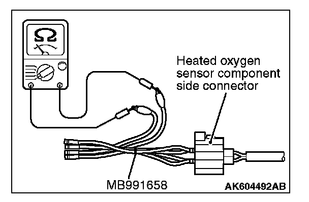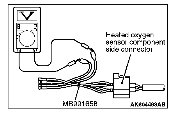 1. Disconnect the heated oxygen sensor connector and connect special tool MB991658 to the connector on the heated oxygen sensor side.