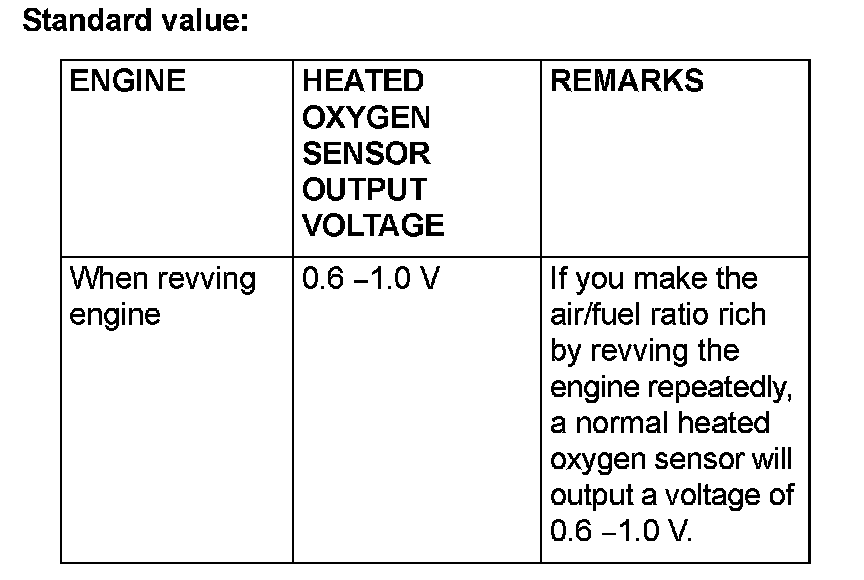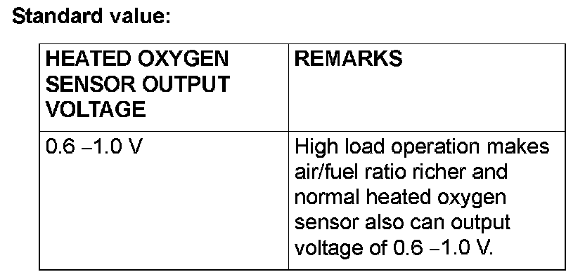 - If the temperature of sensing area does not reach the high temperature [of approximately 400° C (752° F) or more] even though the oxygen sensor is normal, the output voltage would be possibly low in spite of the rich air-fuel ratio.