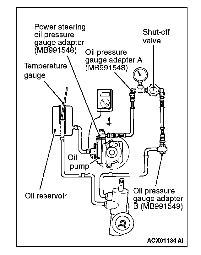 1. Disconnect the pressure hose from the oil pump, and then connect the special tools MB991548, MB990662 and MB991549.