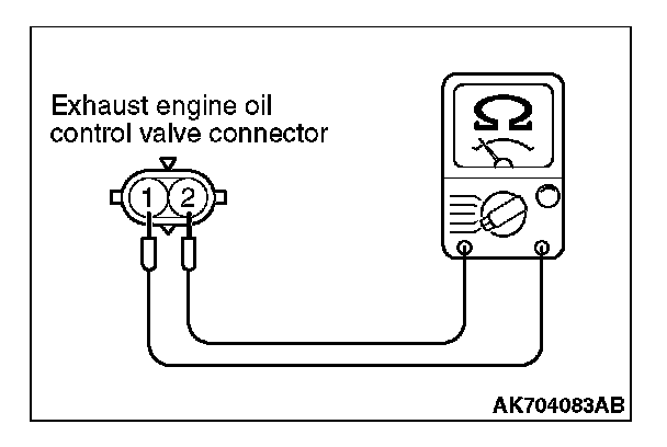 2. Measure resistance between terminal No. 1 and terminal No. 2 of the connector at the exhaust engine oil control valve side.