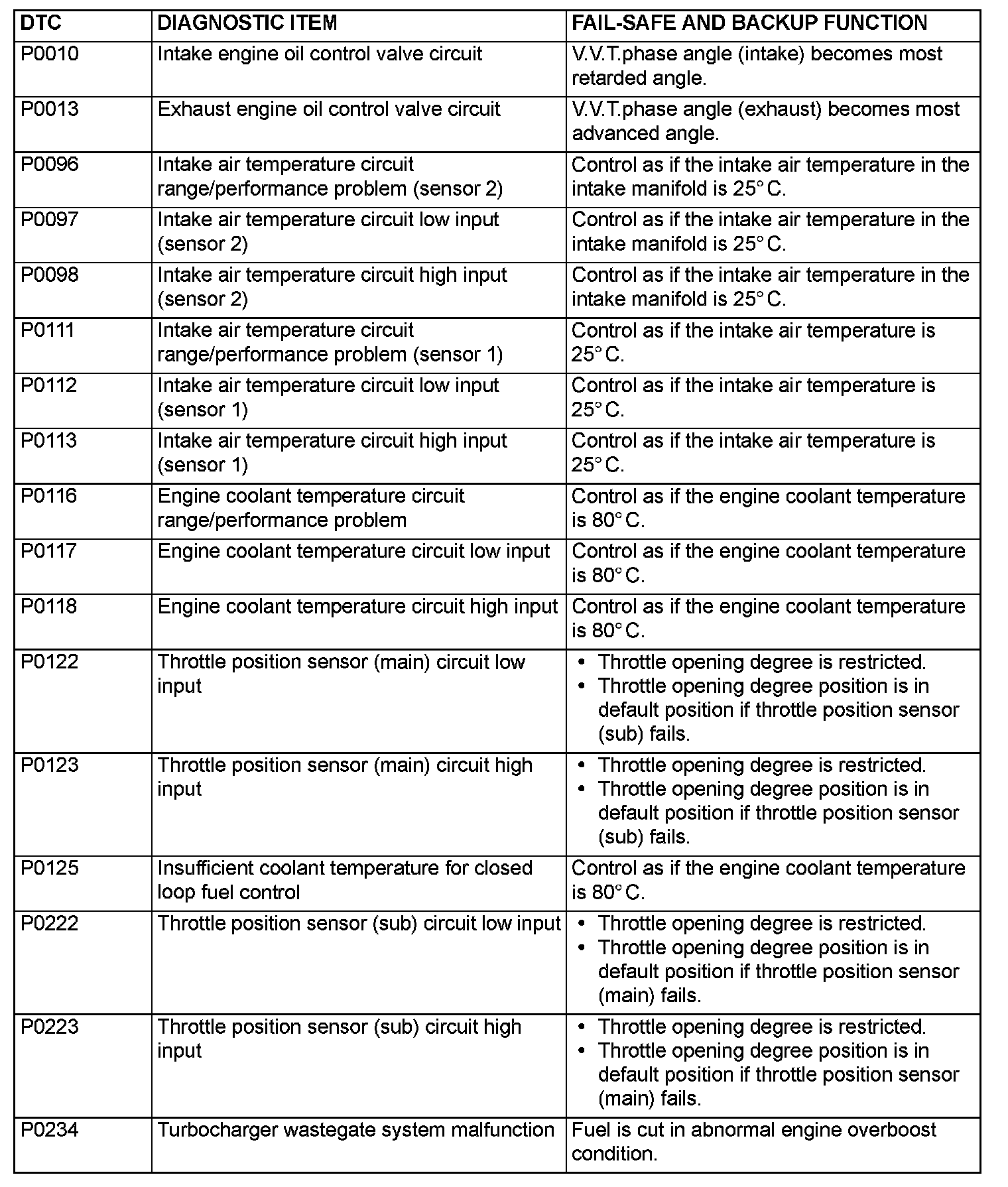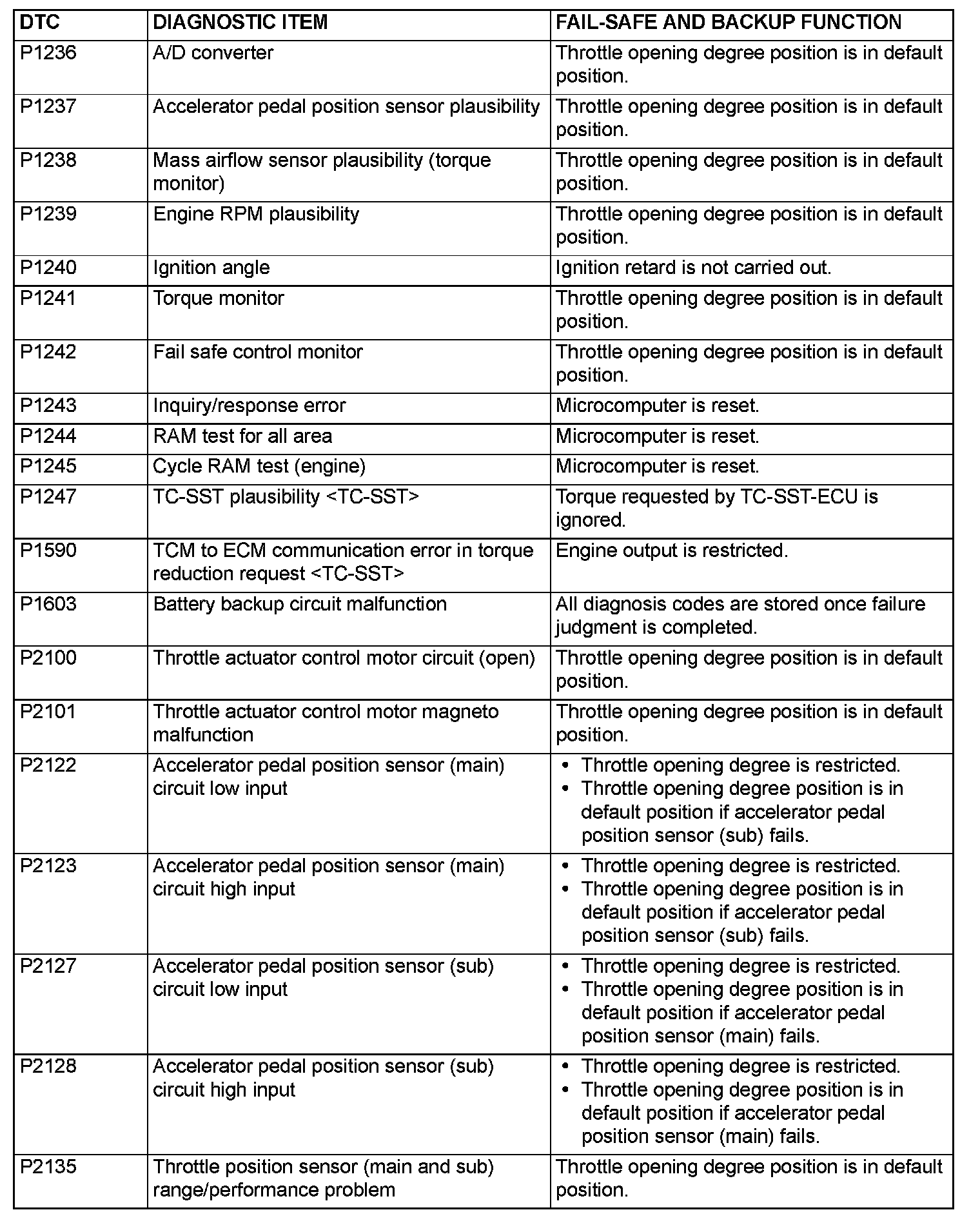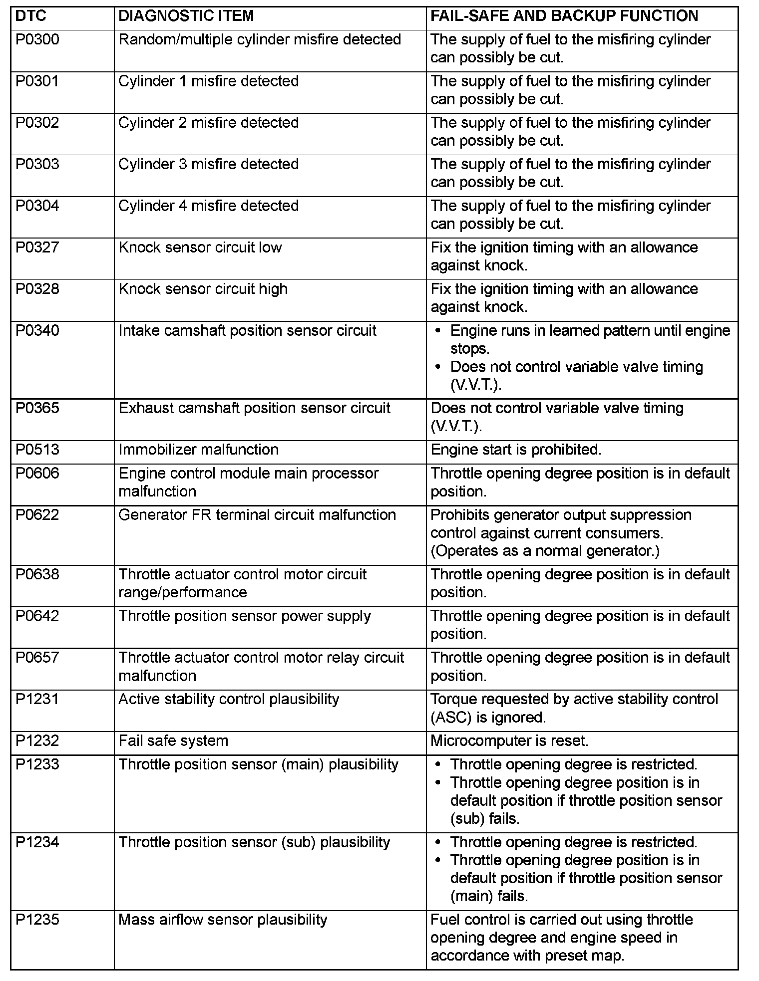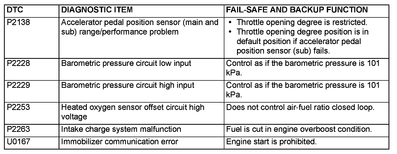 FAIL-SAFE FUNCTION REFERENCE TABLEThe control is carried out, which keeps the safety driving by the preset control logic when the diagnostic trouble code is output. The diagnostic trouble code having the fail-safe function is as follows.