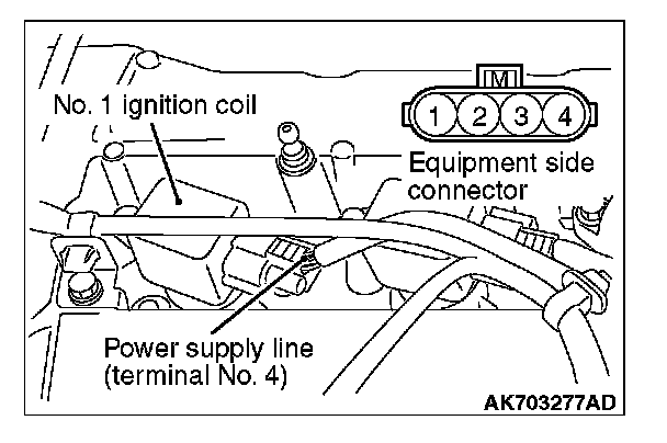 3. Set the timing light to the power supply line (terminal No. 4) of the ignition coil No. 1.
