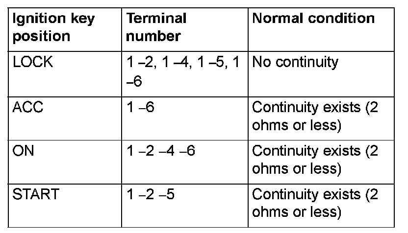 Remove the ignition switch. Then check continuity between the switch terminal.
