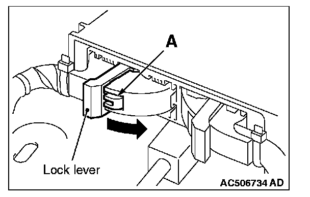 While pushing the part "A" indicated in the figure of the harness side connector, turn the lock lever to the direction of the arrow to release the lock lever.