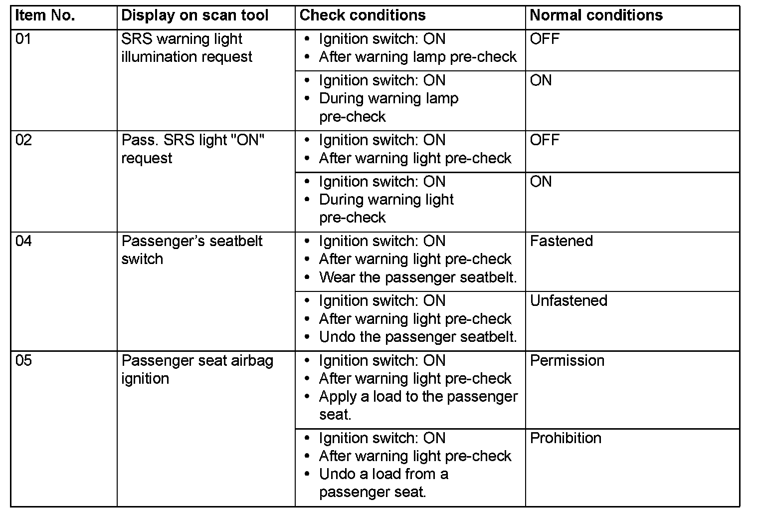 The following items can be read by the scan tool from the SRS-ECU input data.
