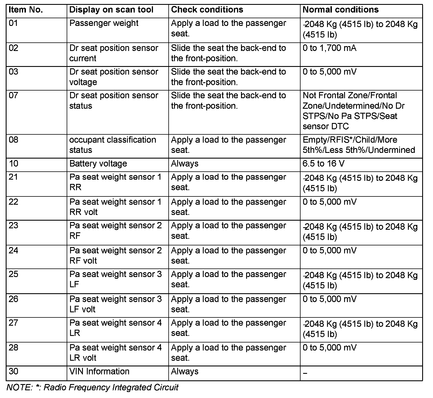 The following items can be read by the scan tool from the occupant classification-ECU input data.