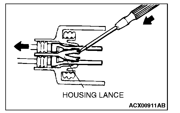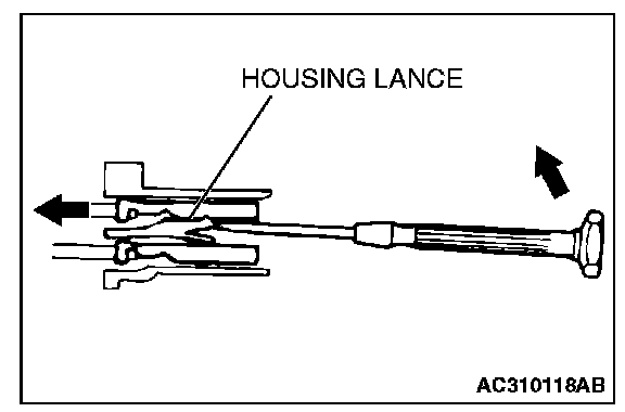 2. Insert the tip of the screwdriver [1.4 mm (0.06 inch) or 2.0 mm (0.08 inch) width] into the connector as shown in the figure, raise the housing lance slightly with the tip, and pull out the terminal.