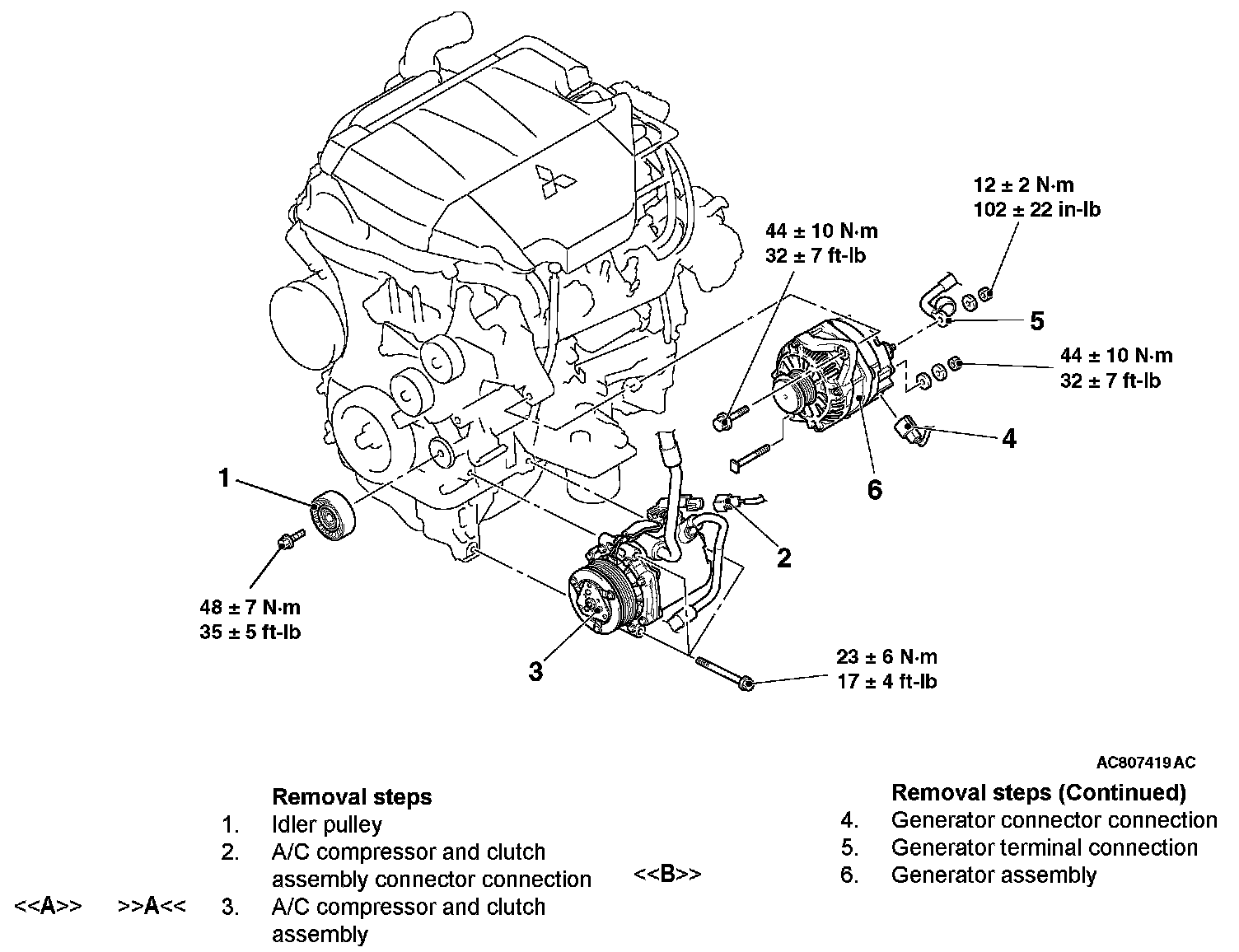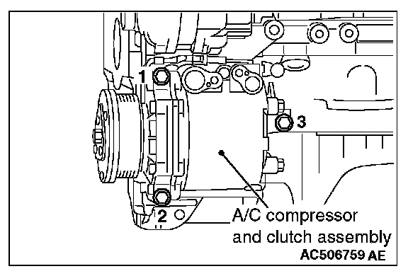 Tighten A/C compressor and clutch assembly mounting bolts to the specified torque in the order of number shown in the illustration.