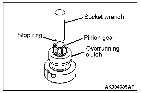 1. Apply a long socket wrench of an appropriate size to the stop ring and strike the wrench to drive out the stop ring toward the pinion gear side.