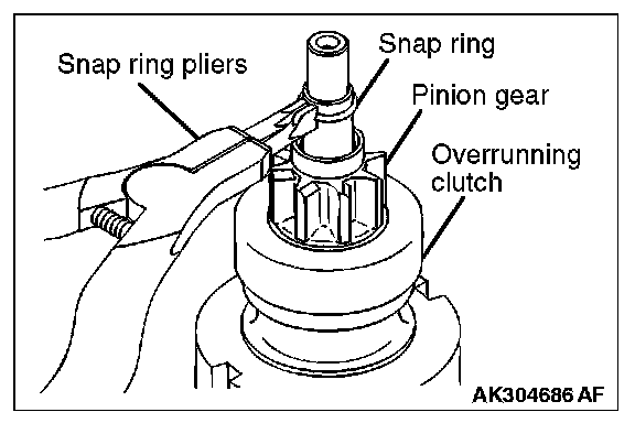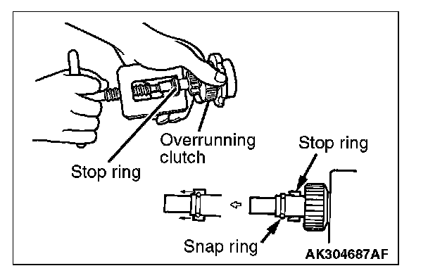 2. Remove the snap ring with snap ring pliers, then remove the stop ring and overrunning clutch.