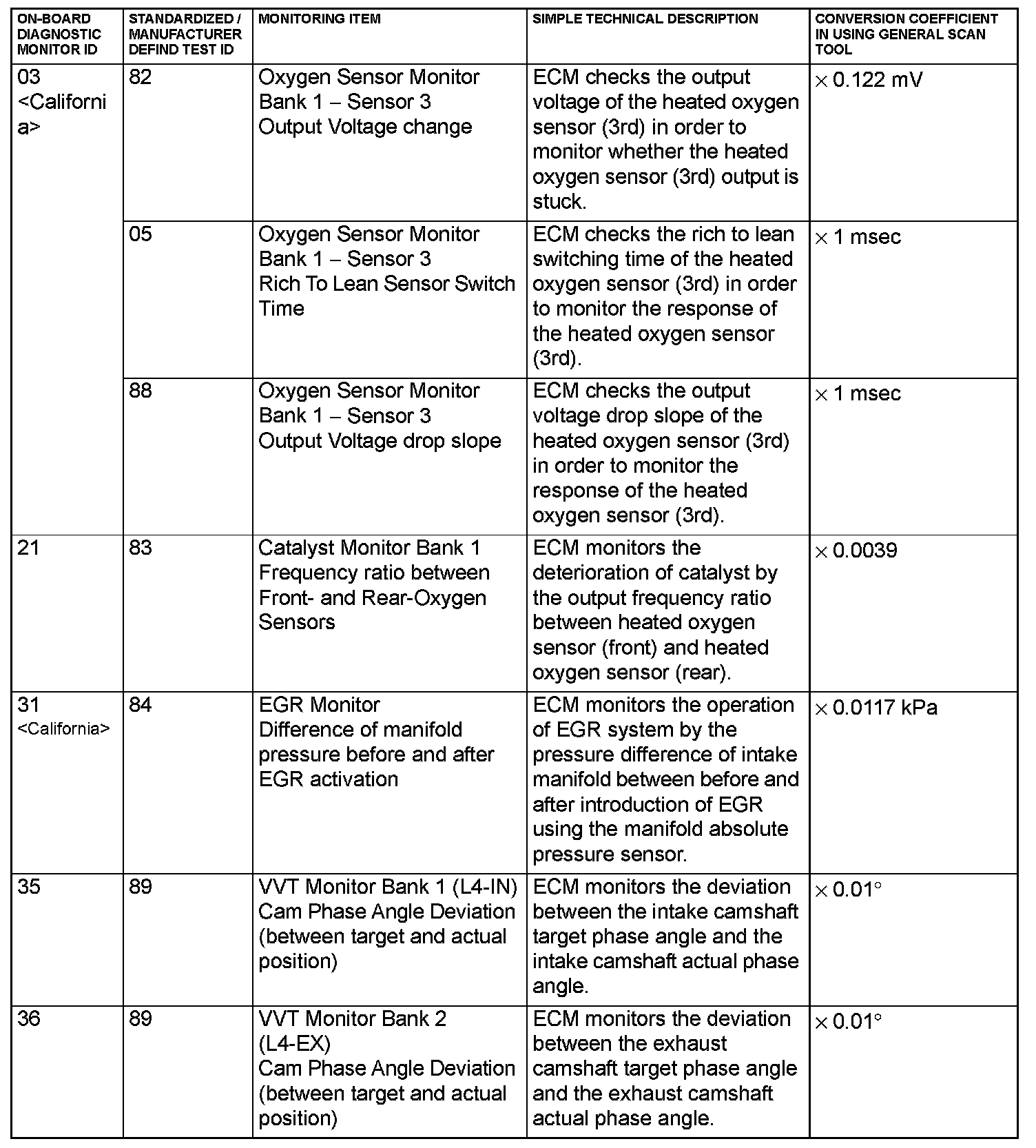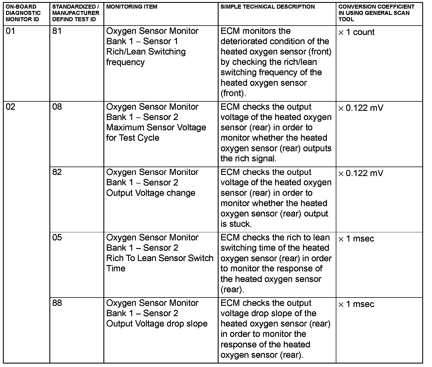 By selecting MODE 6 using scan tool, Test Result and Limit Value (minimum) *1 or (maximum) *2 about the main items of emission control system which ECM monitors can be confirmed. The value at the last monitoring is output by ECM as a test result.