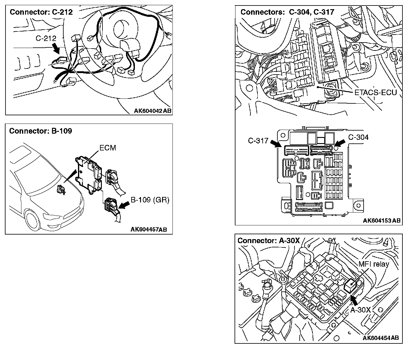 STEP 1. Check harness connector A-30X at MFI relay and harness connector B-109 at ECM for damage.