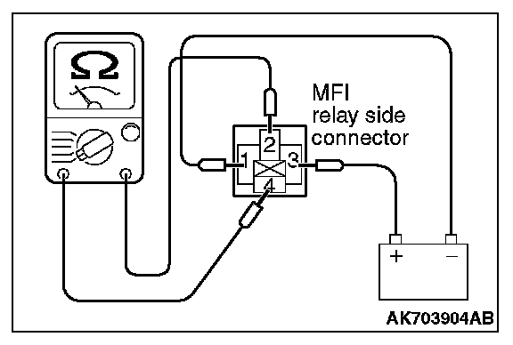 4. Check for continuity between the MFI relay terminals No. 2 and No. 4 while connecting and disconnecting the jumper wire at the negative battery terminal.
