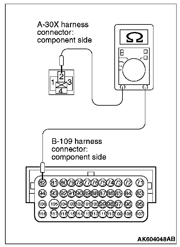 2. Measure the resistance between connector A-30X (terminal No. 2) and connector B-109 (terminal No. 82).