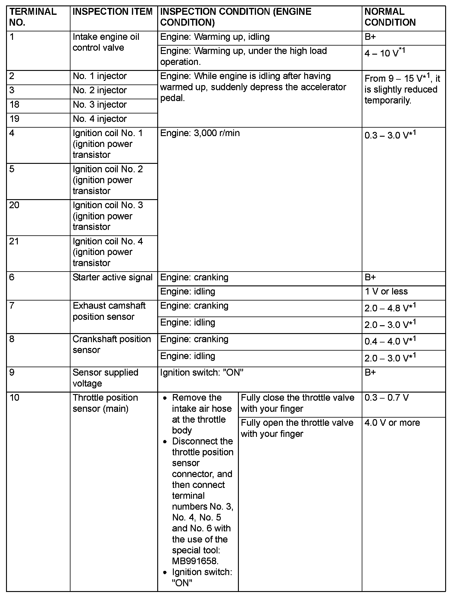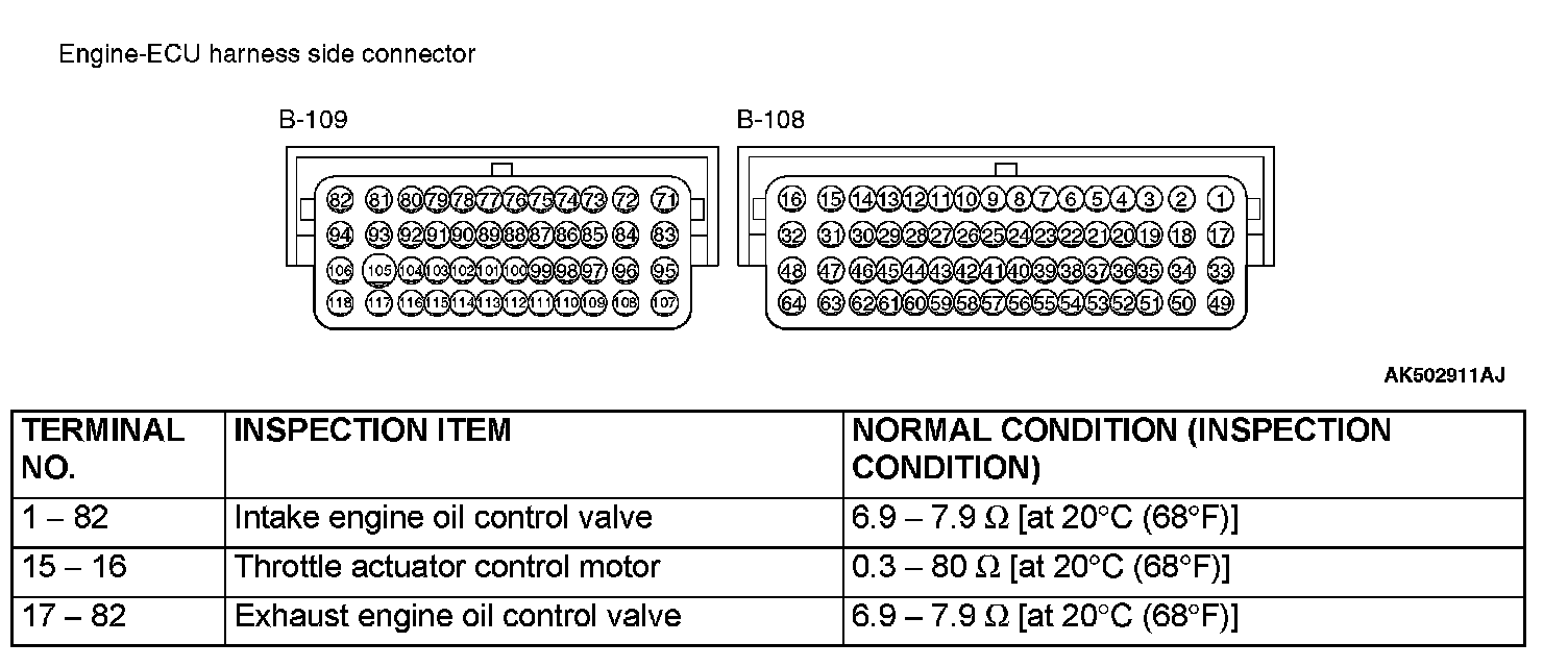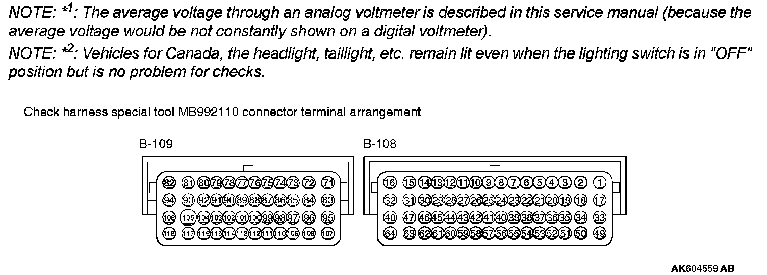 CHECK AT THE ENGINE CONTROL MODULE (ECM)1. Disconnect the ECM connectors B-108 and B-109, and connect check harness special tool MB992110 between the ECM connectors.