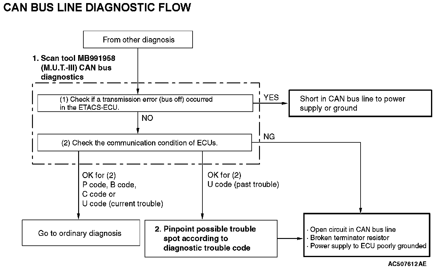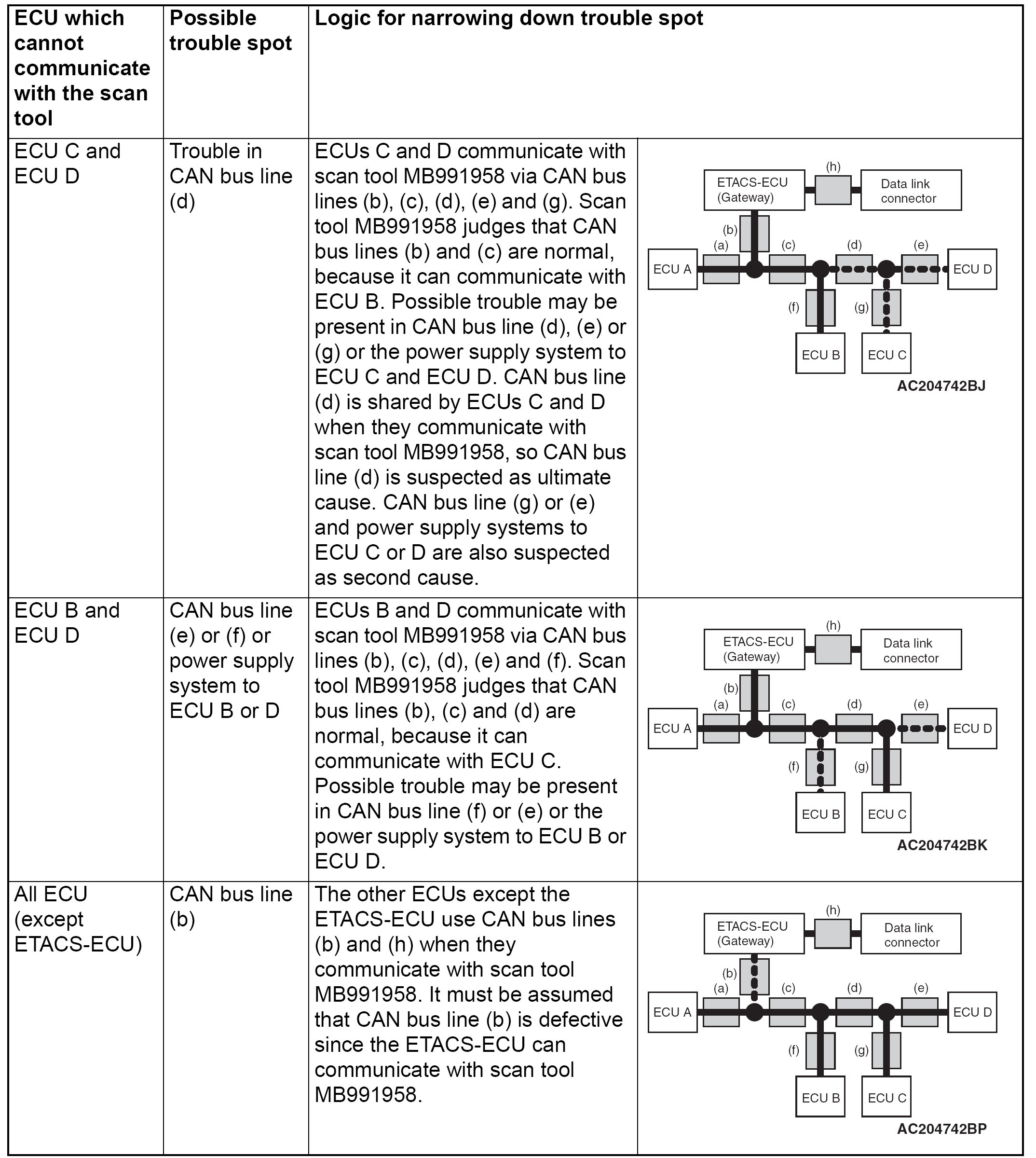 Scan tool MB991958 diagnoses CAN bus lines in accordance with the following strategy.