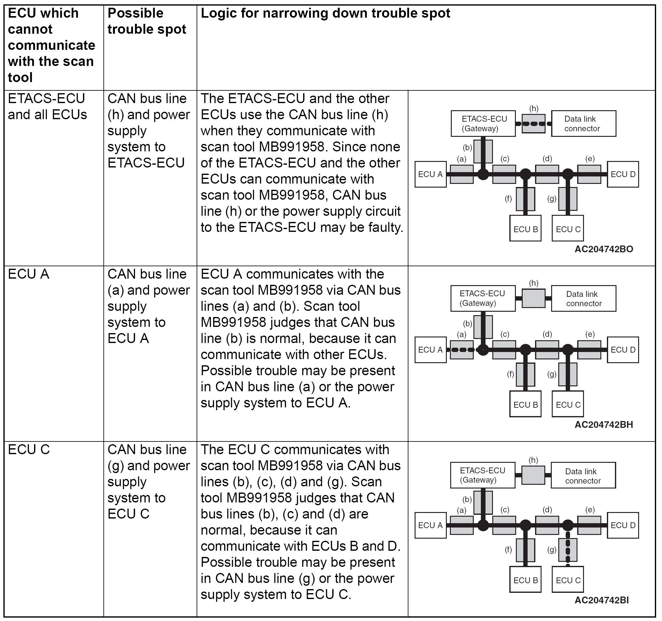 Scan tool MB991958 narrows down troubles in circuit by itself. Its strategies are as follows.