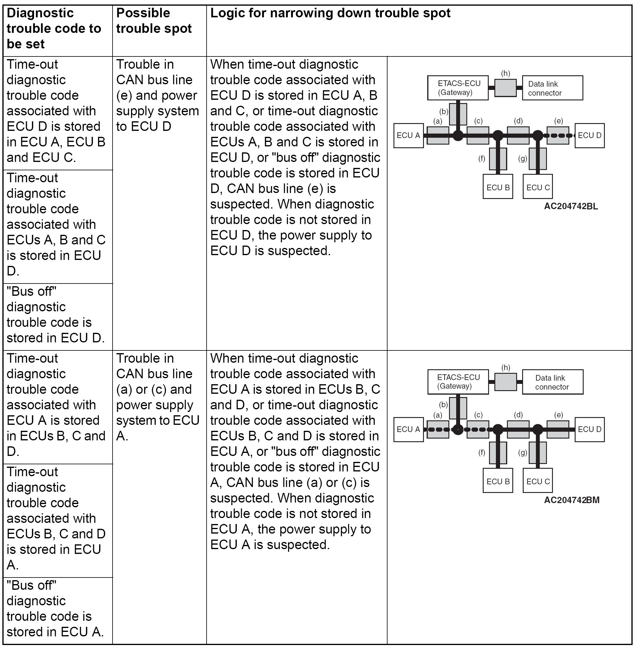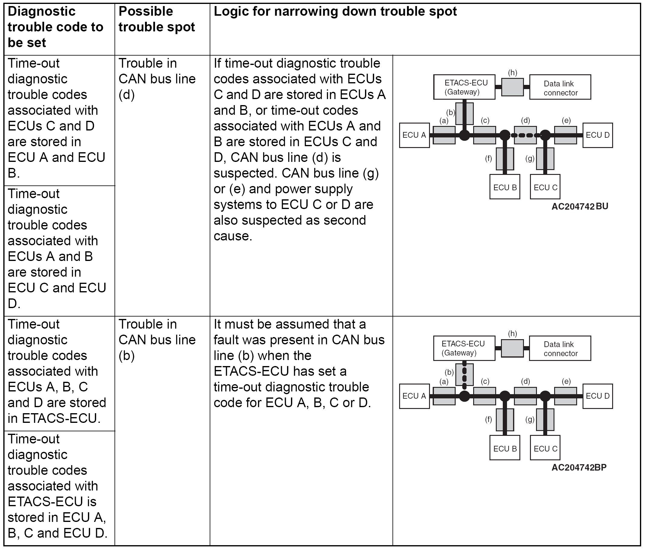 - Time-out diagnostic trouble codes are stored in each ECU memory individually. Therefore, it is possible that these diagnostic trouble codes have not been set simultaneously. If the trouble spot cannot be found when you diagnose by judging from multiple diagnostic trouble codes, check the communication lines between each ECU.